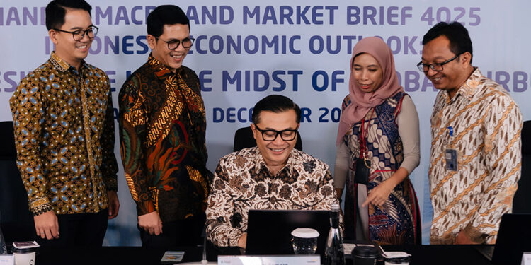 Jakarta, Kabarkansaja.id - Chief Economist Bank Mandiri Andry Asmoro (tengah), Head of Mandiri Institute Andre Simangunsong (kedua kiri), Head of