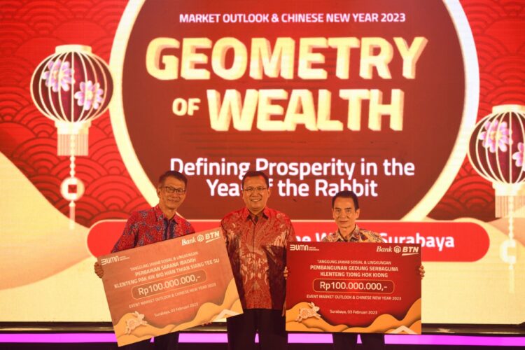 Surabaya, Kabarkansaja.id – Direktur Utama Bank BTN Haru Koesmahargyo (tengah) menyerahkan bantuan Tanggung Jawab Sosial dan Lingkungan (TJSL) kepada perwakilan Klenteng Pak Kik Bio Hian Thain Siang Tee Su dan Klenteng Tjong Hok Kiong dalam Perayaan Chinese New Year atau Imlek 2023 di Surabaya, Jawa Timur, Minggu (5/2/2023). Dalam perayaan Imlek 2023 bersama nasabah BTN Prioritas di Surabaya, Bank BTN juga menggelar diskusi Market Outlook & Chinese New Year 2023 dengan tema “Geometry of Wealth-Defining Prosperity in The Year of The Rabbit”. Tahun ini BTN menargetkan dana kelolaan BTN Prioritas naik 40% menjadi sekitar Rp51,5 triliun dengan peningkatan jumlah nasabah sebesar 15%. (K1)