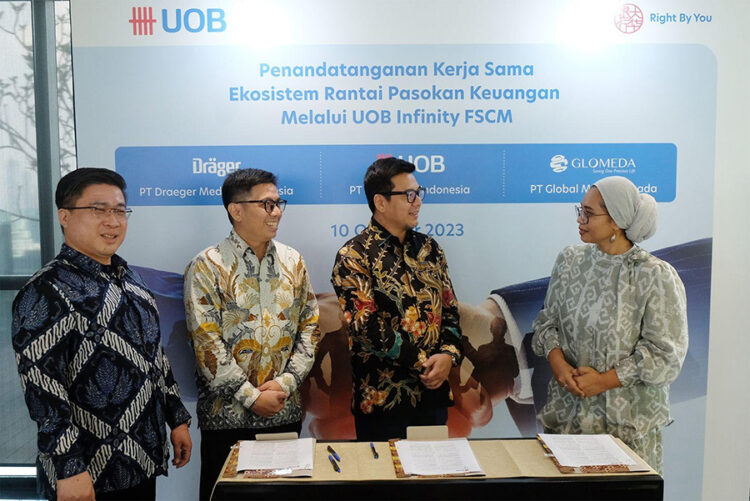 Jakarta, Kabarkansaja.id – Dari kanan ke kiri, Direktur PT Draeger Medical Indonesia Ratna Kurniawati, President Director PT Global Medik Persada Daniel Soeprianto, Head of Corporate Banking PT Bank UOB Indonesia Edwin Kadir, FSCM Coordinator UOB Indonesia Darjong Tungadi berbincang di sela penandatanganan kerja sama di Jakarta, Selasa (10/10/2023).