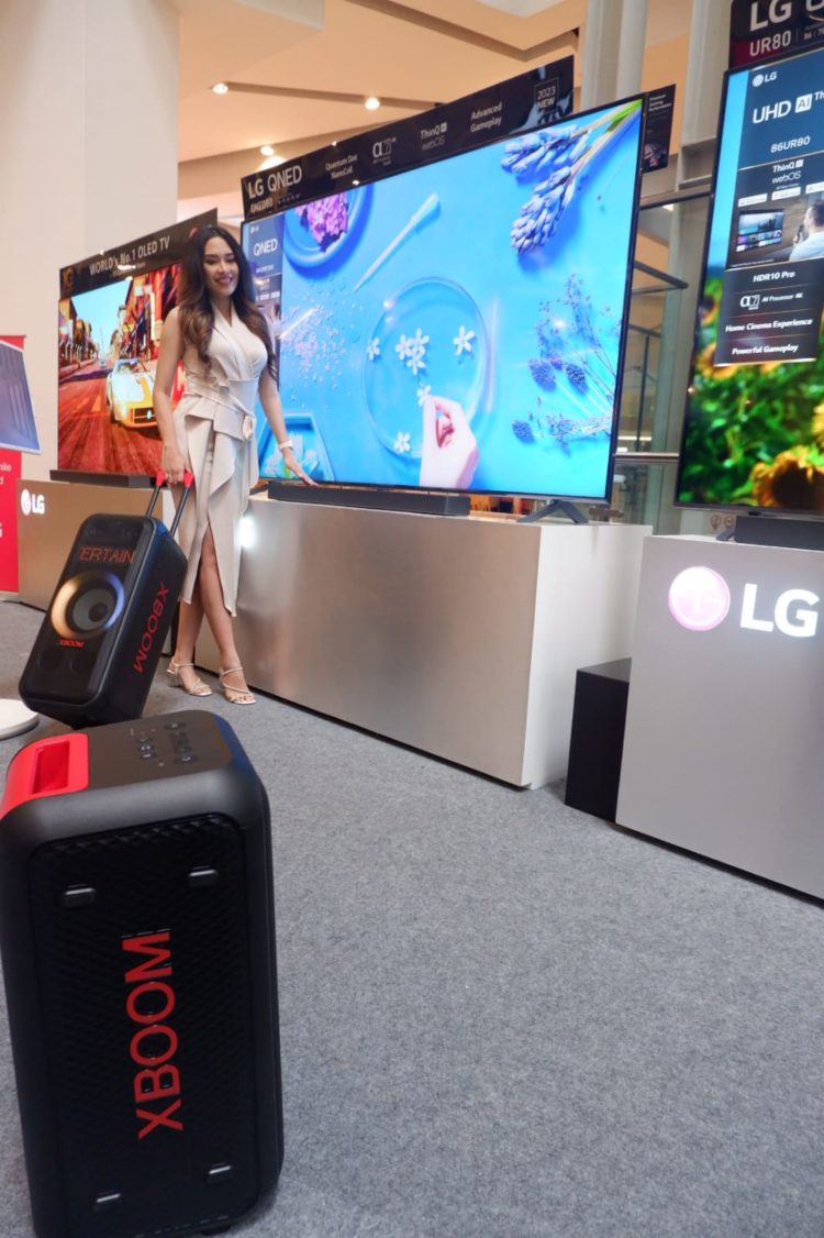 Jakarta, Kabarkansaja.id – Model berpose saat diperkenalkannya koleksi audio terbaru LG yang diperuntukan untuk sinema dan kemewahan pesta di Jakarta. LG memperkenalkan Soundbar terbaru dalam tiga seri yaitu LG S40T, LG S75Q dan LG SC9 yang disiapkan menjadi pelengkap dalam membawa nuansa bioskop melalui TV, serta memperkenalkan XBOOM Party Speaker dengan dua tipe model LG XL5S dan XL7S yang ditujukan sebagai portabel ideal untuk penggunaan luar ruang. (K1)