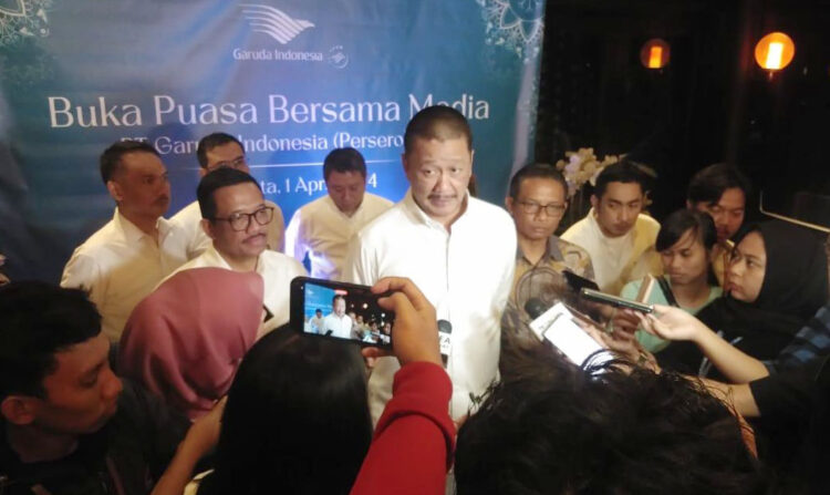 Jakarta, Kabarkansaja.id – Direktur Utama PT Garuda Indonesia (Persero) Tbk Irfan Setiaputra (tengah) didampingi jajaran manajemen saat jumpa pers di sela buka puasa bersama media di Jakarta, Senin (1/4/2024). Pihaknya menyambut positif terkait rencana Garuda Indonesia bergabung ke PT Aviasi Pariwisata Indonesia (InJourney) yang rencananya ditargetkan berlangsung Oktober 2024.