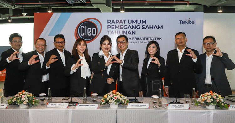 Surabaya, Kabarkansaja.id – Komisaris Utama PT Sariguna Primatirta Tbk (CLEO) Hermanto Tanoko bersama (dari kiri ke kanan) Direktur Supply Chain Firdauf Achmad Dhewata, Direktur Penjualan & Distribusi Toto Sucartono, Komisaris Independen Ida Bagus Oka Nila, Komisaris Belinda Natalia, istri Sanderawati Joesoef, Direktur Utama Melisa Patricia, Direktur Keuangan Lukas Setio Wongso dan Direktur Operasional Nio Eko Susilo, usai saat Rapat Umum Pemegang Saham, di Surabaya, Kamis (30/5/2024).