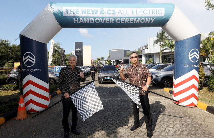 Jakarta, Kabarkansaja.id – Chief Executive Officer PT Indomobil National Distribution Tan Kim Piauw (kiri) bersama CEO Dealer Citroen Santiko Wardoyo (kanan) melakukan prosesi serah terima unit The New Citroën E-C3 All Electric yang diwakili 50 pelanggan di Citroën Experience Center PIK, Jakarta Utara, Jumat (14/6/2024).