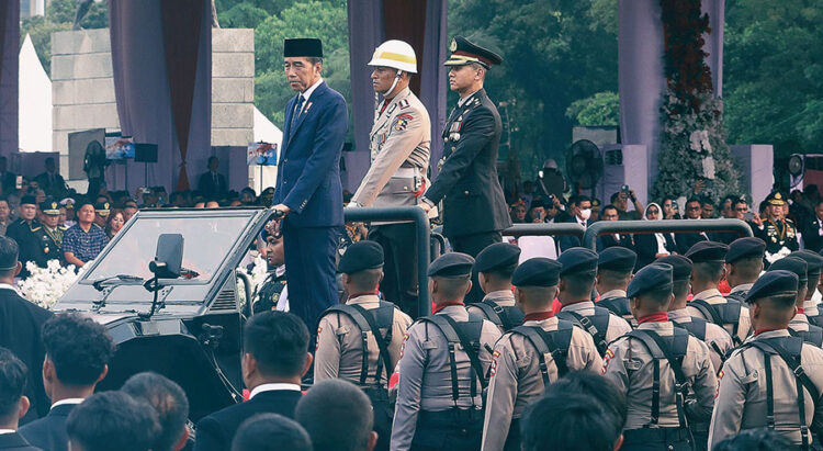 Jakarta, Kabarkansaja.id – Presiden Joko Widodo memeriksa pasukan saat menjadi inspektur upacara HUT Ke-78 Bhayangkara di Lapangan Monas, Jakarta, Senin (1/7/2024).