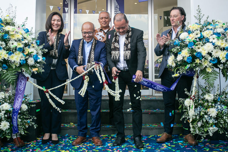 Yogyakarta, Kabarkansaja.id – Country Manager RMA Indonesia Toto Suharto dan Director of PT Mitrabuana Citra Abadi Handono Widjaja, memotong pita pembukaan Dealer Ford 3S Yogyakarta, didampingi President Ford ASEAN and Asia Pacific Direct Market Yukontorn ‘Vickie’ Wisadkosin (kiri), Kepala Dinas Perhubungan Sleman Arif Pramana (tengah) dan Director Automotive Distribution RMA Group Roberto Da Silva, (kanan) di Sleman, Rabu (14/8/2024).