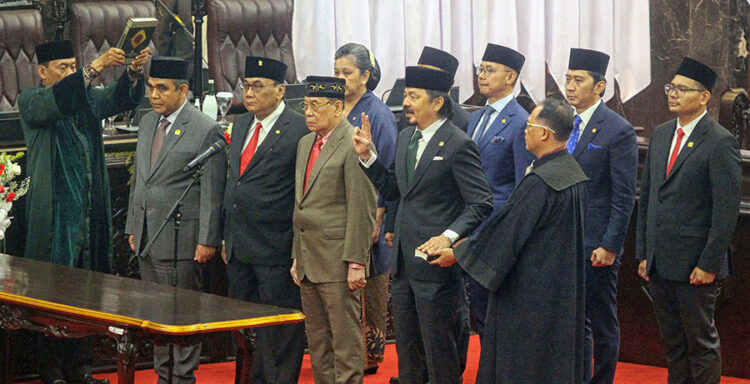 Jakarta, Kabarkansaja.id – Ketua Mahkamah Agung Muhammad Syarifuddin membacakan sumpah jabatan kepada Ketua MPR terpilih periode 2024-2029 Ahmad Muzani bersama Wakil Ketua MPR terpilih masing-masing Abcandra Supratman, Edhie Baskoro, Eddy Soeparno, Hidayat Nur Wahid, Rusdi Kirana, Lestari Moerdijat, Kahar Muzakir, Bambang Wuryanto saat pelantikan pimpinan MPR di Gedung Nusantara, kompleks Parlemen, Senayan, Jakarta, Kamis (3/10/2024). Sidang Paripurna MPR menyetujui Ahmad Muzani dari Fraksi Partai Gerindra menjadi Ketua MPR Periode 2024-2029 menggantikan Bambang Soesatyo yang habis masa bhaktinya selaku Ketua MPR periode 2019-2024. (K1)