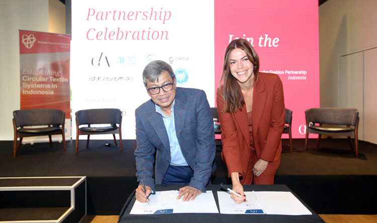 Jakarta, Kabarkansaja.id – Ketua Umum Rantai Tekstil Lestari (RTL) Basrie Kamba (kiri) bersama VP Impact Programmes & Sustainability Global Fashion Agenda (GFA) Holly Syrett saat penandatanganan kerja sama di sela acara peluncuran Circular Fashion Partnership: Indonesia di Jakarta, Kamis (3/10/2024). Kerja sama tersebut bertujuan mengembangkan sistem sirkular fesyen dengan mengumpulkan dan mendaur ulang limbah tekstil pasca-industri, salah satunya dengan meningkatkan ketersediaan material daur ulang. (K1)
