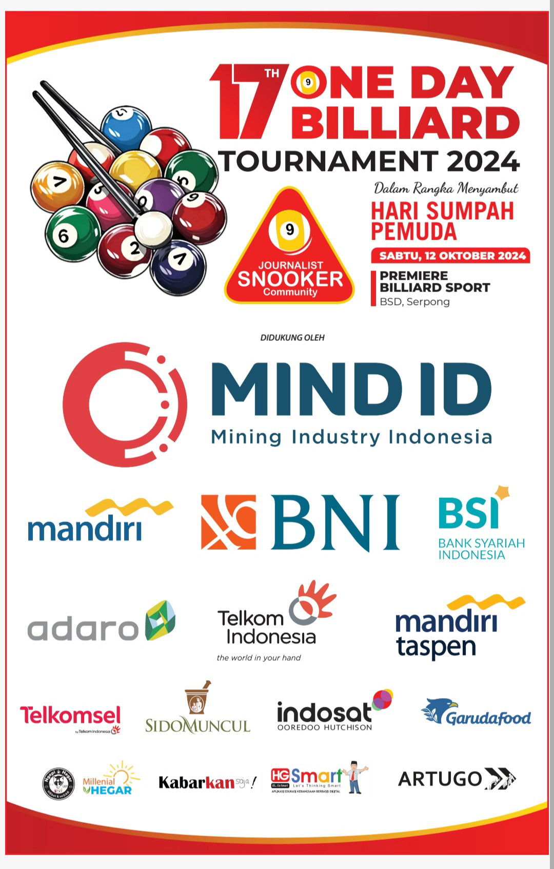 Turnamen biliar antar wartawan, korporasi dan umum yang didukung sejumlah korporasi seperti MIND ID, Bank BNI, Bank Mandiri, Bank BSI, Adaro Energy Indonesia, Telkom, Mandiri Taspen, Telkomsel, Sidomuncul, Indosat, GarudaFood, dan Artugo ini dalam rangka menyambut Hari Sumpah Pemuda. Kabarkansaja.id kembali menjadi media partner event yang digelar rutin tiap tahun ini.