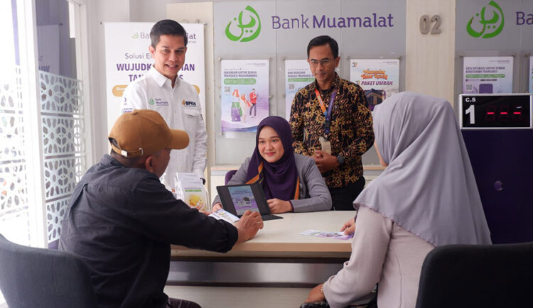 Tangerang Selatan, Kabarkansaja.id – Sekretaris Perusahaan PT Bank Muamalat Indonesia Tbk Hayunaji (kiri) dan Branch Operation Service Manager KC Bintaro Jaya Aris Takomala (kanan) berbincang dengan nasabah yang sedang memproses KPR Hijrah Baitullah di kantor cabang Bank Muamalat Bintaro Jaya, Kamis (24/10/2024). Bank Muamalat menargetkan pertumbuhan pembiayaan kepemilikan rumah (KPR) Hijrah Baitullah yang diluncurkan pada akhir tahun lalu dapat mencapai sekitar 5 kali lipat hingga akhir 2024. Program KPR Hijrah Baitullah memberikan manfaat lebih, yaitu pembiayaan rumah sekaligus memperoleh hadiah langsung Tabungan iB Hijrah Haji/Umrah sebesar Rp 25,5 juta untuk pendaftaran porsi haji atau biaya umrah bagi yang sudah berhaji.