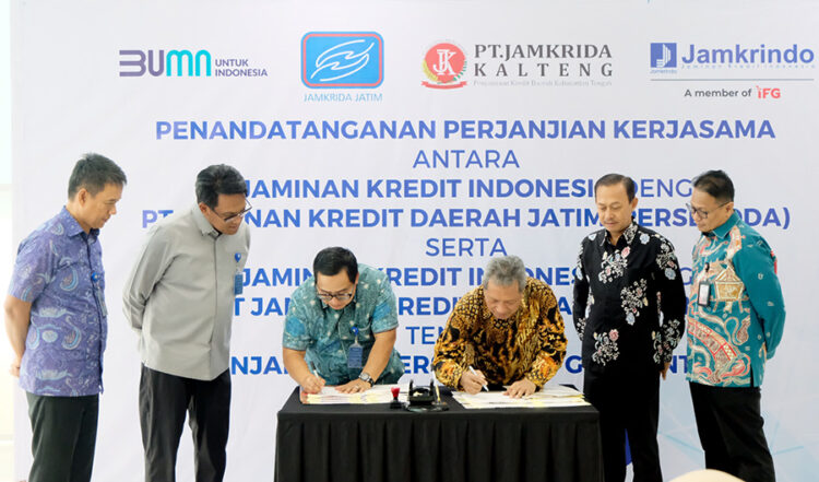 Jakarta, Kabarkansaja.id – Direktur Kelembagaan dan Layanan Jamkrindo Abdul Bari, Direktur Utama Jamkrida Jatim Untung Heri Sukariyanto, Direktur Penjaminan Jamkrida Jatim Sugeng, Direktur Utama Jamkrida Kalteng Eko Multazam disakikan Direktur Bisnis Penjaminan Jamkrindo Henry Panjaitan serta Ketua Asosiasi Perusahaan Penjaminan Indonesia (Asippindo) Ivan Soeparno saat penandatanganan Perjanjian Kerja Sama (PKS) Penjaminan Bersama atau Co-Guarantee Jamkrindo dengan PT Penjaminan Kredit Daerah Jatim (Perseroda) dan PT Penjaminan Kredit Daerah Kalteng di Jakarta, Kamis (23/1/2025).
