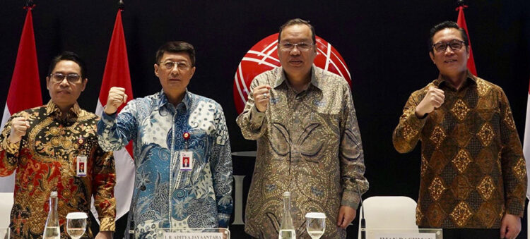 Jakarta, Kabarkansaja.id – Direktur Utama BEI Iman Rachman (dua dari kanan) bersama (dari kiri ke kanan), Kepala Departemen Pengaturan dan Pengembangan Perbankan OJK, Eddy Manindo Harahap, Deputi Komisioner Pengawas Pengelolaan Investasi Pasar Modal dan Lembaga Efek I. B. Aditya Jayaantara dan Direktur Pengembangan PT Bursa Efek Indonesia (BEI) Jeffrey Hendrik, usai memberikan keterangan di Jakarta, Selasa (8/4/2025).