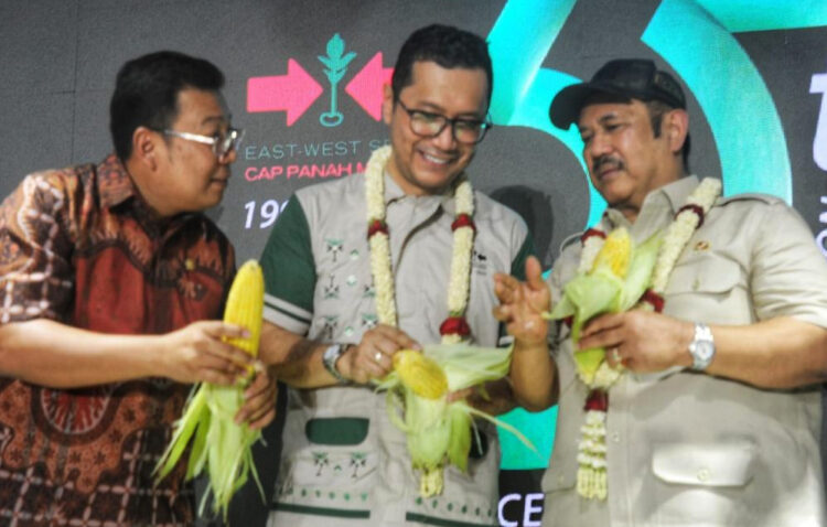 Purwakarta, Kabarkansaja.id – Menteri Perencanaan Pembangunan Nasional (PPN)/ Kepala Badan Perencanaan Pembangunan Nasional (Bappenas) Rachmat Pambudy (kanan) dan Kepala Badan Pangan Nasional (Bapanas) Arief Prasetyo Adi (kiri) didampingi Managing Director PT East West Seed Indonesia Glenn Pardede (tengah) secara simbolis saat akan menanam Jagung NB Super di Purwakarta, Jawa Barat, Rabu (14/5/2025).