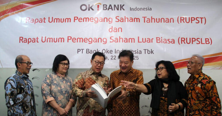 Jakarta, Kabarkansaja.id – Dari kiri ke kanan, Direktur Kepatuhan Efdinal Alamsyah, Direktur Bisnis Vincentia M. Djuniwati W, Wakil Direktur Utama Hendra Lie, Perwakilan OK Next Co.Ltd Kun Hong Lim, Komisaris Independen Sondang Martha Samosir, dan Komisaris Independen Chairudin, berbincang di sela RUPST/LB PT Bank Oke Indonesia Tbk (OK Bank/DNAR) di Jakarta, Kamis (22/5/2025).