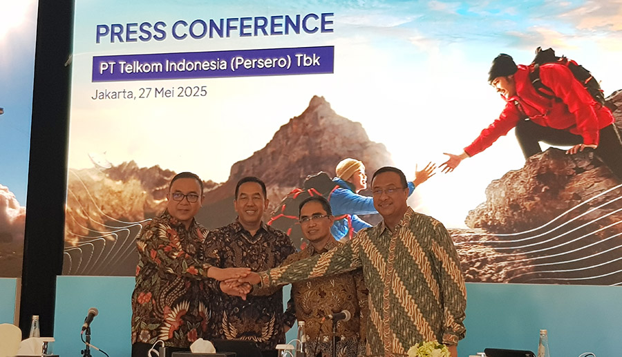 Jakarta, Kabarkansaja.id – Wakil Direktur Utama PT Telkom Indonesia (Persero) Tbk (TLKM) Muhammad Awaluddin (dua dari kiri) bersama Direktur Wholesale and International Service TLKM Honesty Bashir, Direktur Human Capital Management TLKM Henry Christiadi, dan Direktur Network TLKM Nanang Hendarno di sela jumpa pers usai RUPST Telkom di Jakarta, Selasa (27/5/2025).