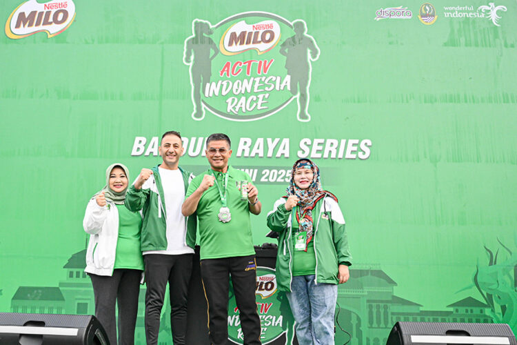 Bandung, Kabarkansaja.id – Wakil Gubernur Jawa Barat Erwan Setiawan (kedua kanan), Kepala Dinas Kesehatan Provinsi Jawa Barat Vini Adiani Dewi (kanan), Direktur Corporate Affairs & Sustainability PT Nestlé Indonesia Sufintri Rahayu (kiri) dan Business Executive Officer Beverages & Culinary Dairy Business Unit PT Nestlé Indonesia Alaa Shaaban (kedua kiri) pada acara Road to MILO ACTIV Indonesia Race 2025 Bandung Raya Series di Kota Baru Parahyangan Bandung, Minggu (1/6/2025).