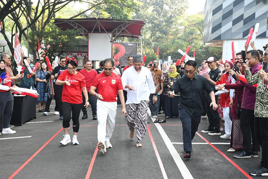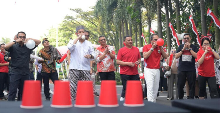 Bandung, Kabarkansaja.id – Direktur IT Digital Telkom Faizal Rochmad Djoemadi, Direktur Wholesale & International Service Telkom Honesti Basyir, Direktur Enterprise & Business Sevice Telkom Veranita Yosephine, dan Direktur Srategic Business Development & Portfolio Telkom Seno Soemadji saat mengikuti lomba dalam suasana perayaan HUT Kemerdekaan RI ke-80 di Graha Merah Putih Telkom Bandung, Minggu (17/8/2025). Telkom turut serta memeriahkan HUT RI dengan melibatkan seluruh karyawan dan mitra.