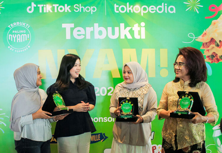 Jakarta, Kabarkansaja.id – Category Development Senior Lead Tokopedia and TikTok Shop, Sherine Pranata (kedua kiri) bersama para pemenang Terbukti Paling NYAM! 2025 kategori Seller Paling Favorit Pilihan Creator, masing-masing Marketing Mercon Merah Putih, Wulan (kiri), perwakilan Sajodo Snack & Food, Devi (ketiga kiri), dan Owner Pisang Goreng Bu Nanik, Nanik Soelistiowati (kanan) di sela pengumuman pemenang Terbukti Paling NYAM! 2025 di Jakarta.