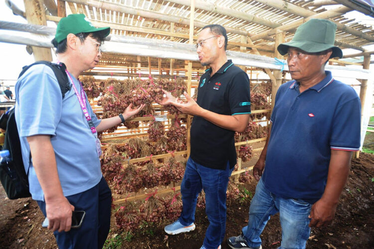 Cimaung, Kabarkansaja.id – Direktur R&D PT East West Seed Indonesia (EWINDO) Fatkhu Rokhman (tengah) bersama petani bawang merah Tono Suwarna (kanan) memberikan penjelasan kepada ISHS Chairman of Working Group Edible Alliums Prof. Masayoshi Shigyo (kiri) di Rumah Bawang, Cimaung, Jawa Barat, Kamis (18/9/2025).