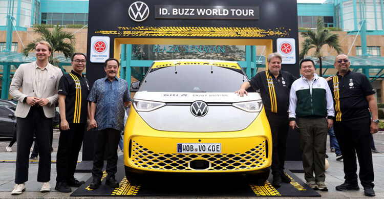 Jakarta, Kabarkansaja.id – Dari kiri ke kanan, Attaché, Embassy of Federal Republic of Germany Jakarta Thomas Beck, Chief Operating Officer Volkswagen Indonesia Edo Januarko Chandra, President Director Indomobil Group Jusak Kertowidjojo, World Record Holder & Long-distance Driver with Volkswagen Rainer Zietlow, Director Indomobil Group Andrew Nasuri, dan Brand Development Indomobil Group Stefan Hutahayan, foto bersama saat menyambut kedatangan ID. BUZZ World Tour di Jakarta, Selasa (28/10/2025).